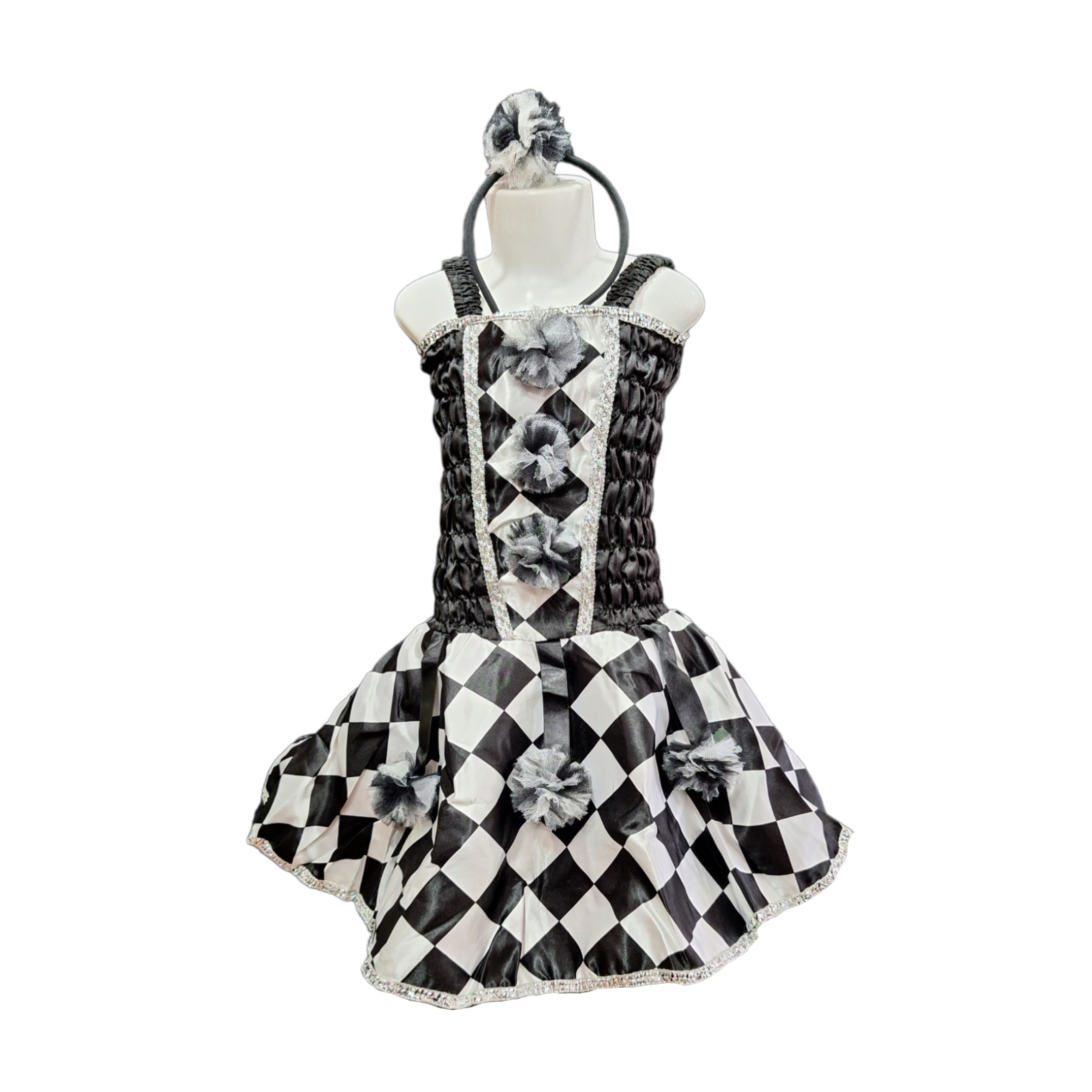 A base da fantasia é um vestido exuberante em tons vibrantes preto e branco. O vestido é ricamente adornado com rendas e laços e uma tiara com adorno conferindo um toque de luxo e feminilidade.